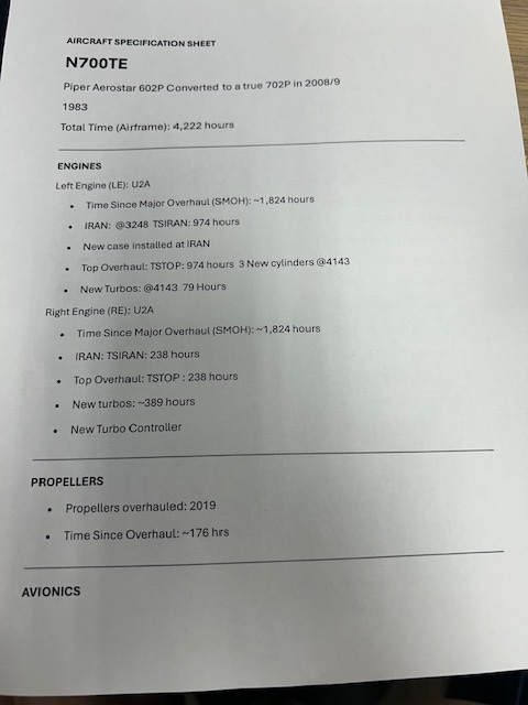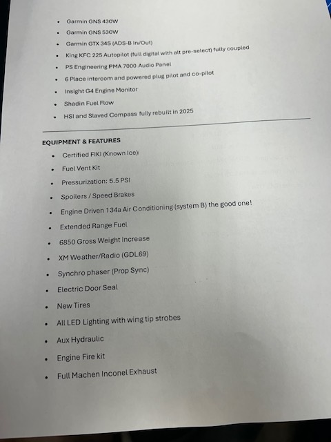 WORLDS FASTES PISTON TWIN, Thats a distinction only this airplane has. This LOW time PIPER built ROCKETSHIP has 4222 TT 5.5 PSI means no WS replacement, Both engines at TBO but only 974 and 234 since IRAN, both recent new turbos,both recent top overhaul, Low time props,Garmin avionics with KFC 225AP Alt hold, preselect, and VS.G4 engine monitor, fuel flows, LR fuel,6850 gross, full machen INCONEL exhaust,I believe it has every mod available,see spec sheet, formerly owned by president of Aerostar, FIKI, cold AC, A all weather aircraft way below BOOK VALUE so call NOW, WE LOVE to trade MAGA